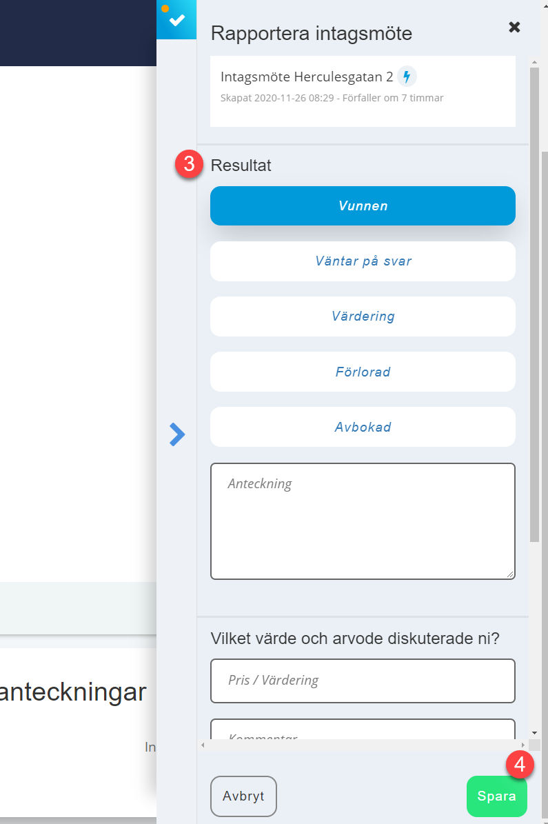 När du fått uppdraget och väljer “vunnen” bör du gå in på objektet, och under Intag och Uppdrag, sätta rätt status enligt vilken produkt du har sålt in till kunden.
