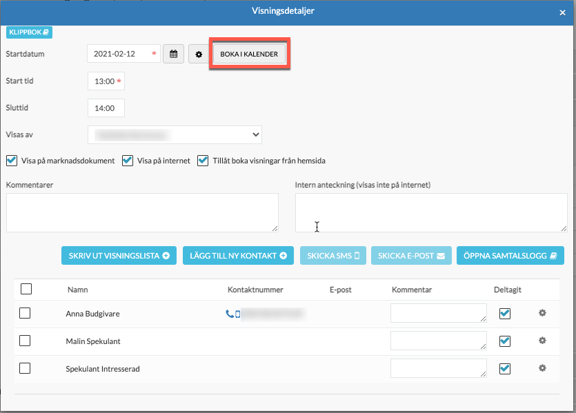 Om du väljer att boka i din egna eller mäklarens kalender via kugghjulet kan du, till skillnad från via knappen BOKA I KALENDERN, redigera i bokningen samt skicka kalenderbokningen till flera personer.