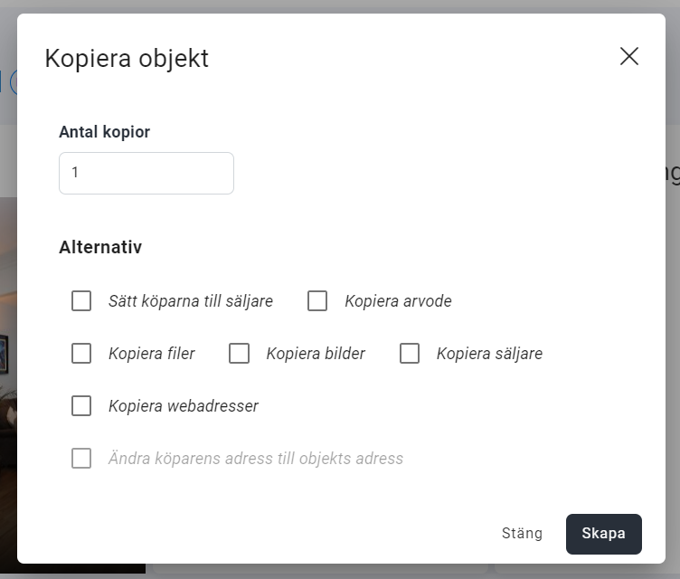 Du får då upp en ruta där du får välja hur många kopior du vill göra, samt vilken information du vill ta med dig från ursprungsobjektet. Klicka sedan på skapa.