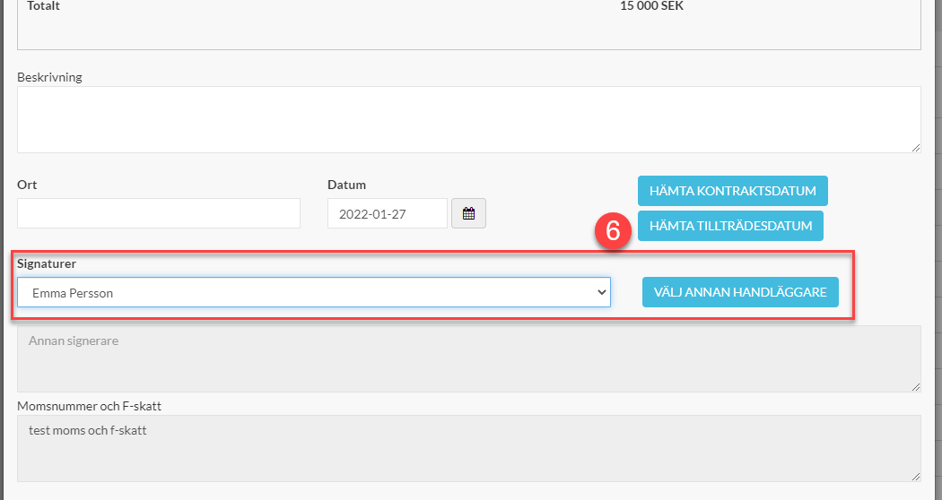 - Ni kan lägga till mäklaren som Signerare längst ned under "Signaturer", alternativt en assistent/kollega som har hand om bokföringen eller tillträdet.