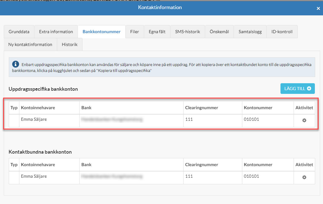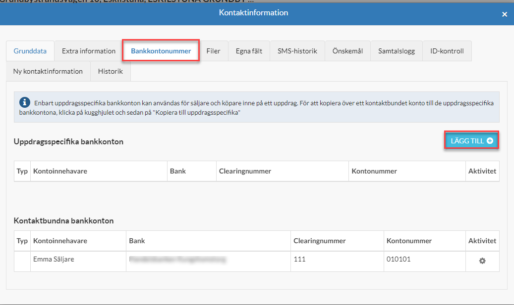 Det nuvarande kontot som är kopplat till objektet visas under ”Uppdragsspecifika bankkonton”. Kontonummer du sparar kommer att synas på det objektet som kontakten öppnas ifrån.