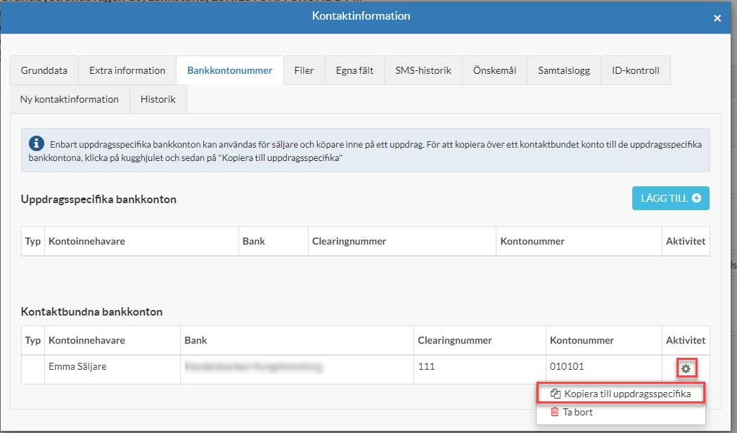 Enbart uppdragsspecifika bankkonton kan användas för säljare och köpare inne på ett uppdrag. För att kopiera över ett kontaktbundet konto till de uppdragsspecifika bankkontona, klicka på kugghjulet och sedan på "Kopiera till uppdragsspecifika".
