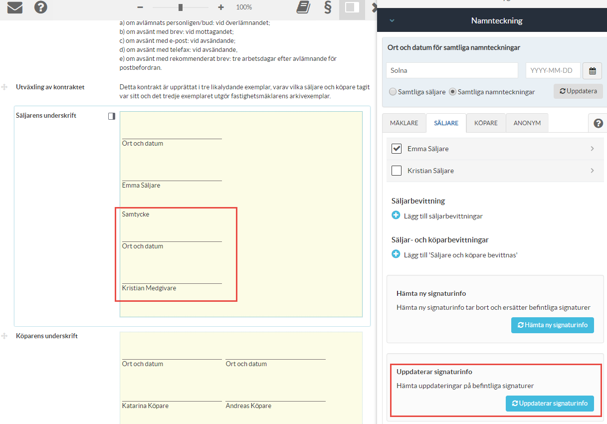 1. Om inte namnet kommer in kontraktet kan du behöva klicka på den gula bakgrunden vid säljarens underskrift för att öppna sidomenyn till höger. Där kan du sedan "uppdatera signaturinfo".