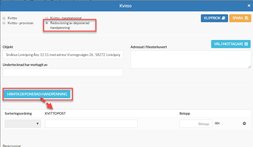 4. Redovisning av deponerad handpenning - Uppgifterna om handpenningen kan hämtas in per automatik från fliken "Efterarbete kontrakt" om du fyllt i utbetalningarna från klientmedelskontot där. Läs mer om hur du hanterar handpenningen här.