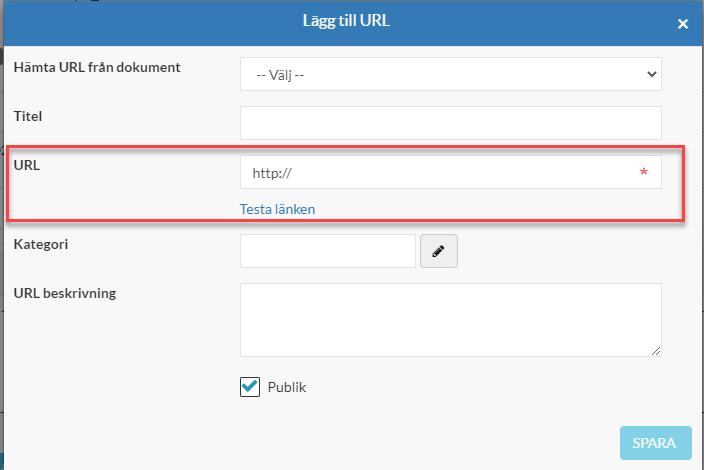 Klicka därefter på fliken Webbadresser och sen på "lägg till". Fyll i titel och klistra in url du vill länka till i fältet "URL", viktigt att "Publik" är ibockat för att det ska visas:
