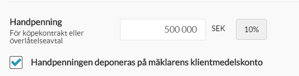 I fältet för handpenning har du möjlighet att klicka på knappen "10%" för att systemet ska räkna ut 10% av slutpriset, men du kan även skriva in handpenningsbeloppet manuellt.