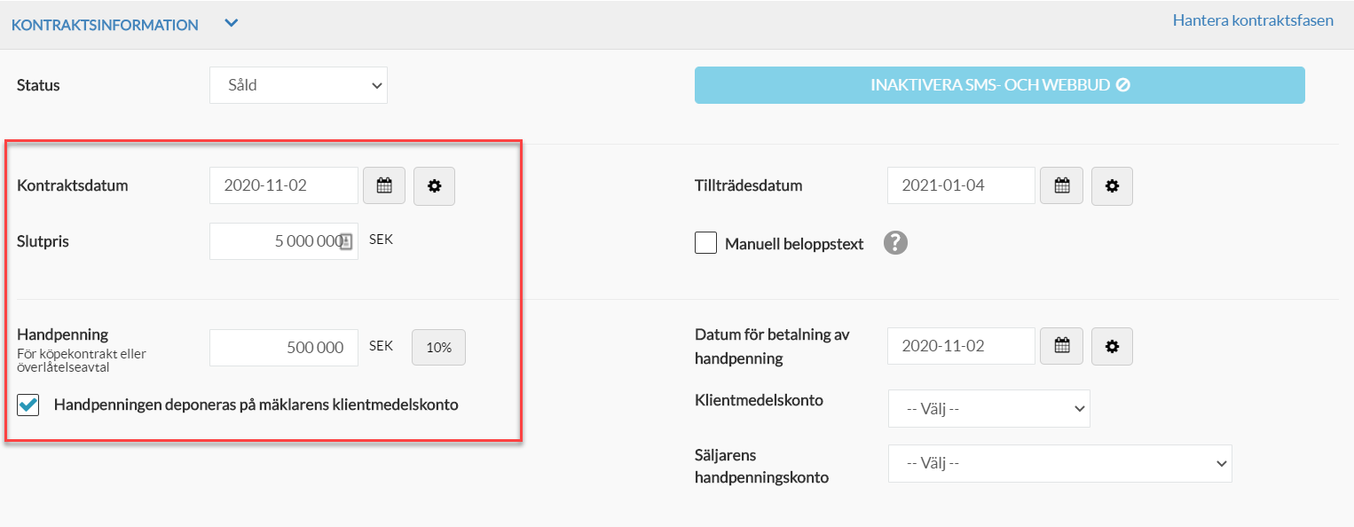 Viktigt att bocka i ”Handpenning deponeras på mäklarens klientmedelskonto”.