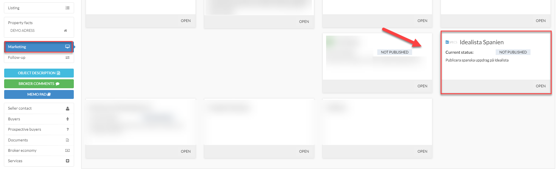 For publishing to Idealista, go to "Marketing" in the left menu in the property and click on the tab "publish". Then open Idealista Spain.