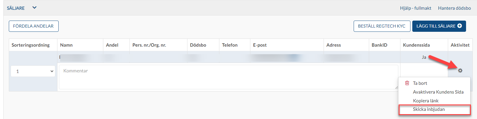 Klicka på kugghjulet längst ut till höger på respektive säljare -> Aktivera kundens sida. Om du därefter klickar på kugghjulet igen kan du välja att skicka inbjudan via e-post eller kopiera länk och skicka den på valfritt sätt.