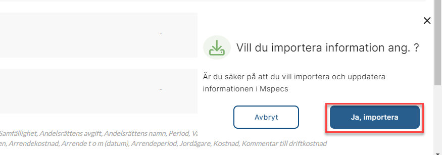 7. Kontrollera vilka uppgifter av säljarens uppgifter som ska importeras till objektet och klicka på "importera till Mspecs".